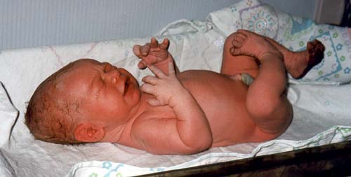 ![]() This picture was taken using Nikki's 35mm while Cameron was being weighed. We really couldn't believe how moulded his head was! The shape returned to normal by the end of the next day but this photo proves that he really was a conehead when he arrived. | |